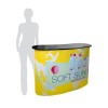Il desk è ottimo per fiere ed eventi. La grafica può essere applicata nello sviluppo della base e se previsto nel cartello superiore.