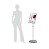 Cornice girevole a scatto in alluminio con foglio di plastica trasparente per la protezione della grafica. Dotata di base estensibile a pavimento in acciaio cromato.