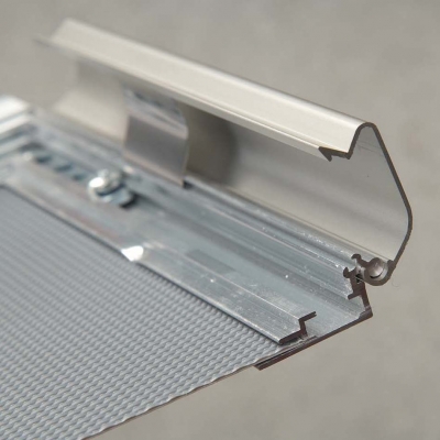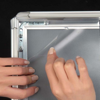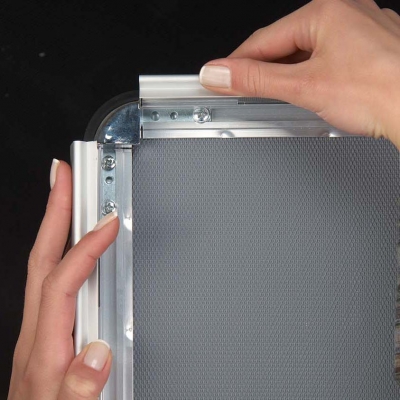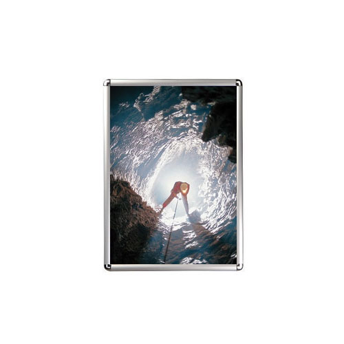Cornice in alluminio con angoli stondati, estrema facilità di utilizzo grazie alla cornice a scatto, con protezione antiriflesso.Cornici “snap frame” caratterizzate dall’estrema facilità d’uso grazie alla cornice (profilo di 32mm) di tipo “click-clack”, dotato di protezione antiriflesso in PVC che protegge il poster / la grafica dagli effetti della luce. I ganci in metallo consentono un fissaggio a parete stabile e duraturo.