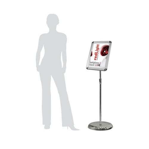 Cornice girevole a scatto in alluminio con foglio di plastica trasparente per la protezione della grafica. Dotata di base estensibile a pavimento in acciaio cromato.Raffinata, versatile, pratica. La tabella informativa ideale per presentare i tuoi contenuti, in formato A4 o A3.